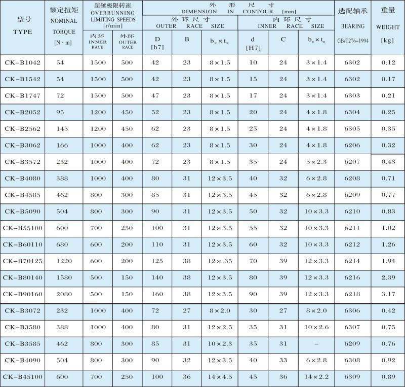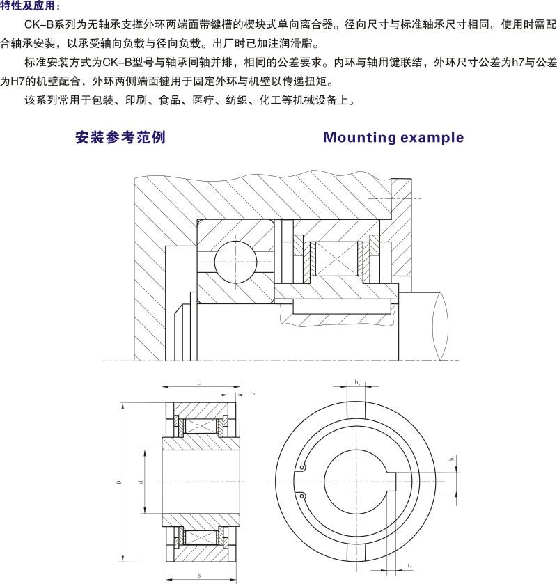 CK-B系列為無軸承支撐外環兩端面帶鍵槽的楔塊式單向離合器。