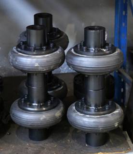 裝配時用螺栓與兩半聯軸器的凸緣連接,依靠擰緊螺栓使輪胎與凸緣端面之間產生的摩擦力來傳遞轉矩,輪胎環工作時發生扭轉剪切變形,故輪胎聯軸器具有很高的彈性,補償兩軸相對位移的能力較大,并有良好的阻尼,而且結構簡單、不需潤滑、裝拆和維護都比較方便。其缺點是承載能力不高、外形尺寸較大,隨著兩軸相對扭轉角的增加使輪胎外形扭歪,軸向尺寸略有減小,將在兩軸上產生較大的附加軸向力,使軸承負載加大而降低壽命。輪胎聯軸器高速運轉時,輪胎外緣離心力的作用而向外擴張,將進一步增大附加軸向力。為此,在安裝輪胎聯軸器時應采取措施,使輪胎中的應力方向與工作時產生的應力方向相反,以抵消部分附加軸向力,達到改善聯軸器和兩軸承的工和條件