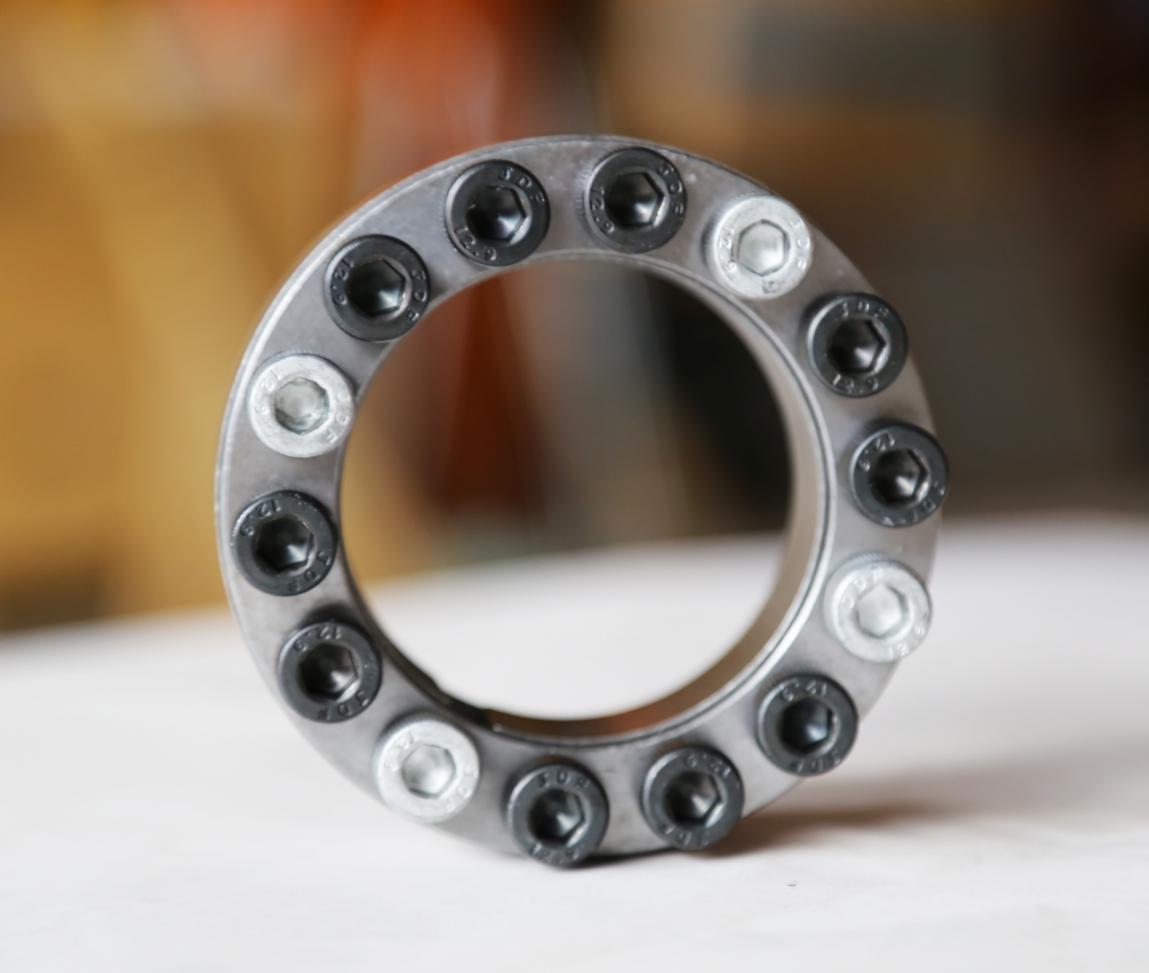 3. 取下頂出的鍍鋅螺釘,將頂出螺釘旋入前壓環的輔助螺孔中,輕輕敲擊被脹緊的傳動件, 使其脹環松動,即可將脹套拉出